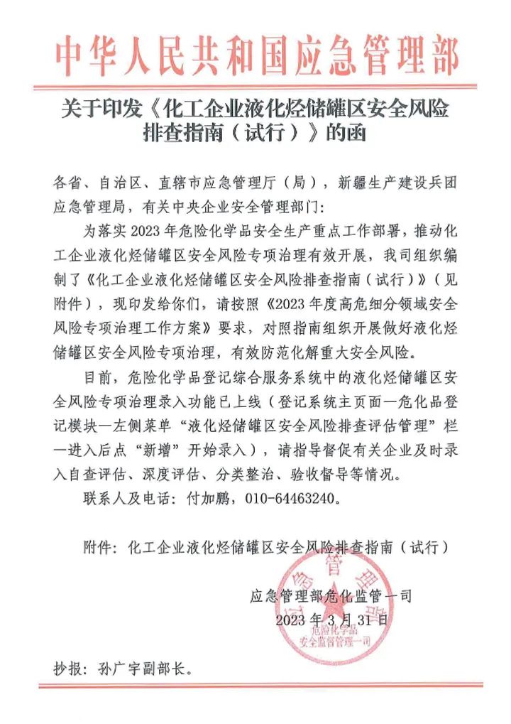 为落实2023年危险化学品安全生产重点工作部署,推动化工企业液化烃储罐区安全风险专项治理有效开展,近日,应急管理部危化监管一司组织编制了《化工企业液化烃储罐区安全风险排查指南(试行)》,要求按照《2023年度高危细分领域安全风险专项治理工作方案》,对照指南组织开展做好液化烃储罐区安全风险专项治理,有效防范化解重大安全风险。