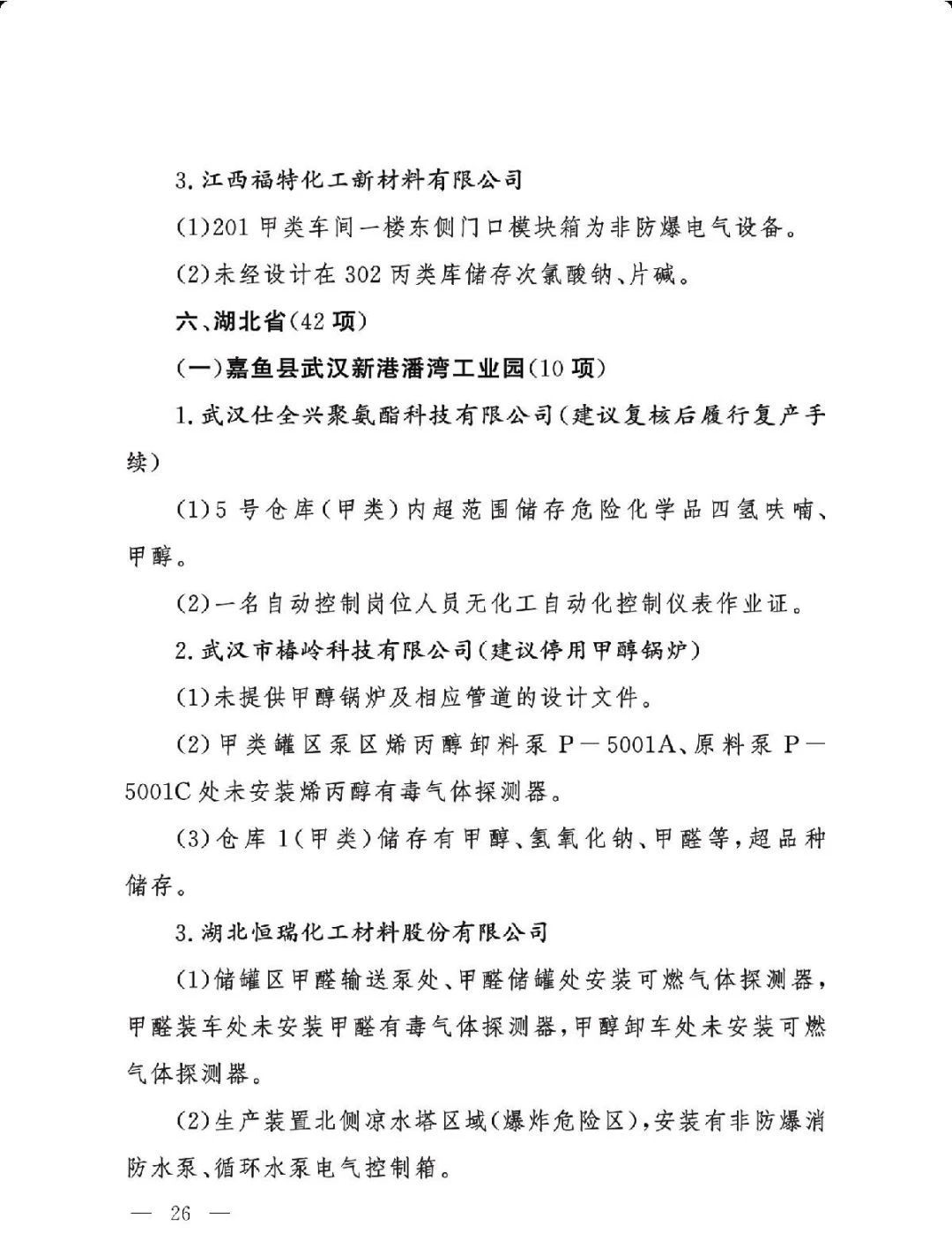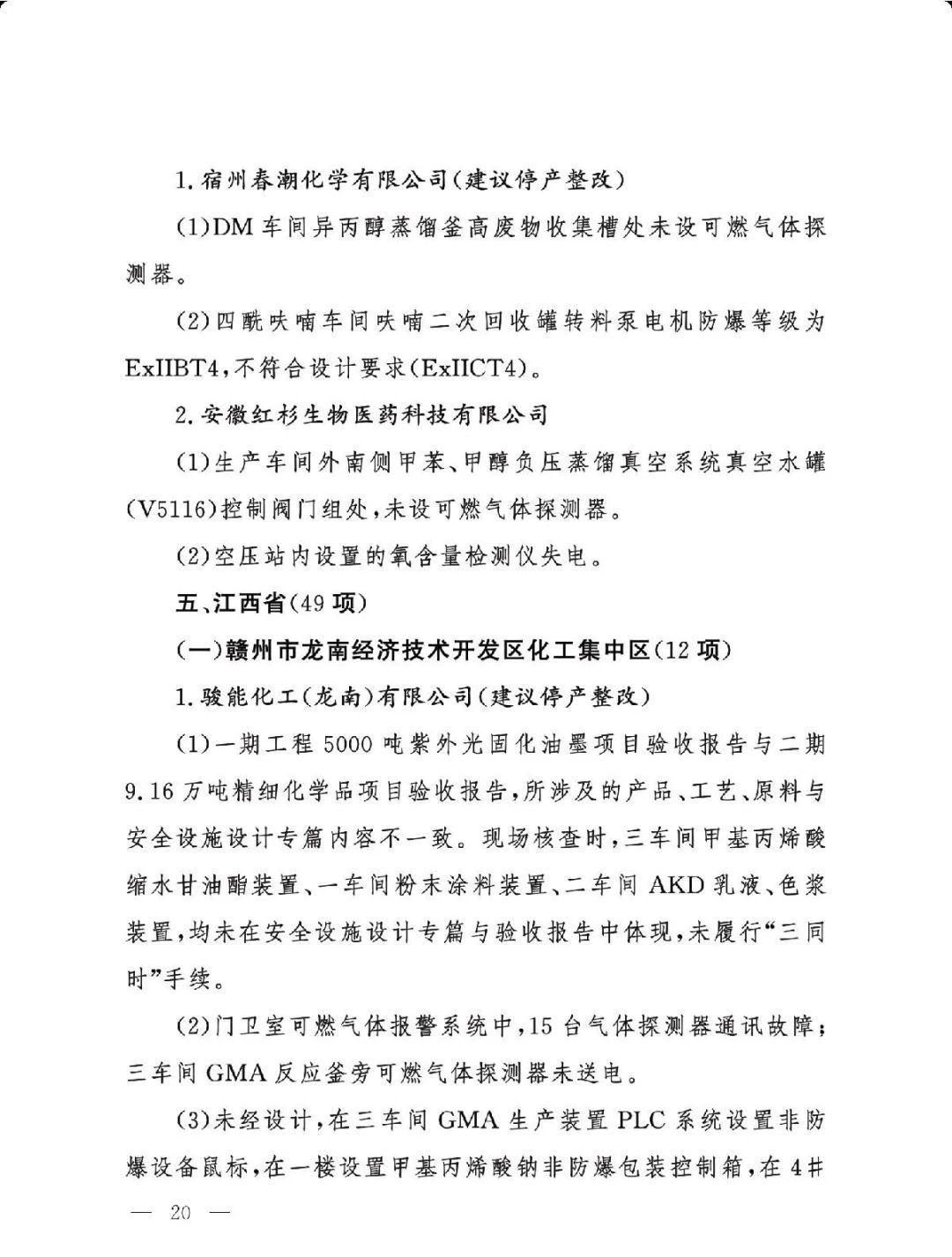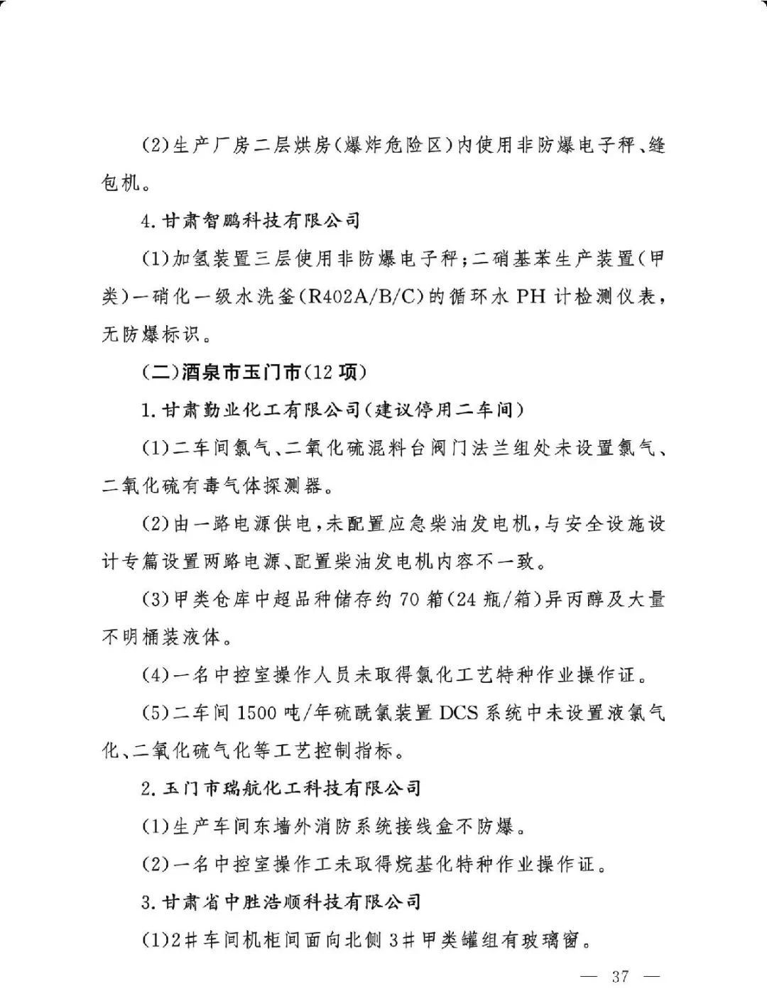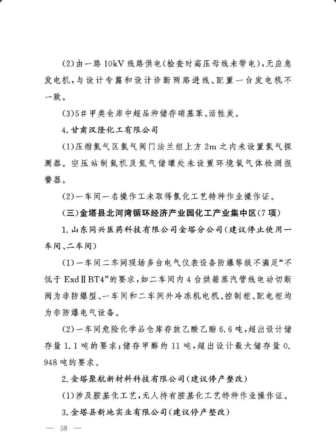 (二)基础差风险高的现状未根本改变。一是部分企业隐患问题突出。江西核查的19家企业平均问题数29.5项,平均重大隐患数2.6项。甘肃核查的24家企业中,62.5%的企业因重大隐患多、不具备安全生产条件被建议停产整改或停用相关设施。二是个别化工园区基础差。山西、湖南、青海还有4个园区尚未认定。