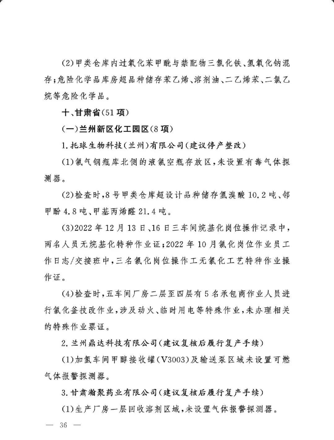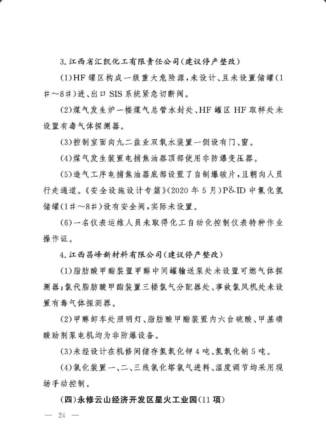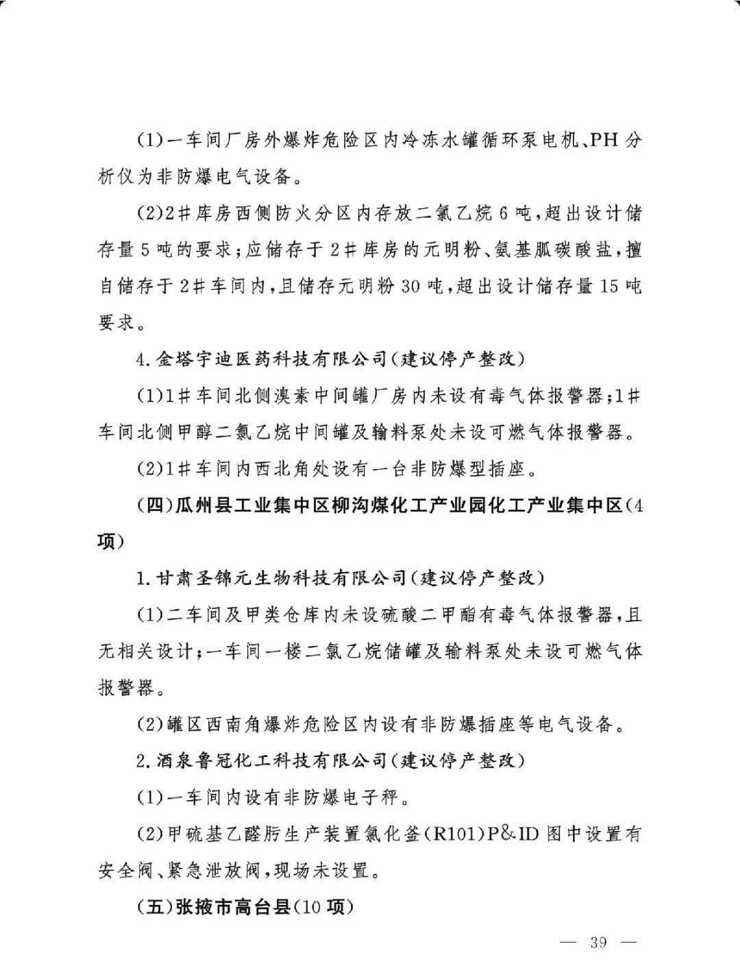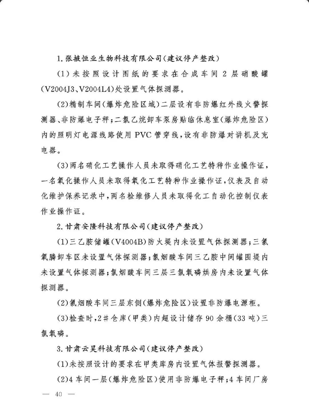 (二)基础差风险高的现状未根本改变。一是部分企业隐患问题突出。江西核查的19家企业平均问题数29.5项,平均重大隐患数2.6项。甘肃核查的24家企业中,62.5%的企业因重大隐患多、不具备安全生产条件被建议停产整改或停用相关设施。二是个别化工园区基础差。山西、湖南、青海还有4个园区尚未认定。