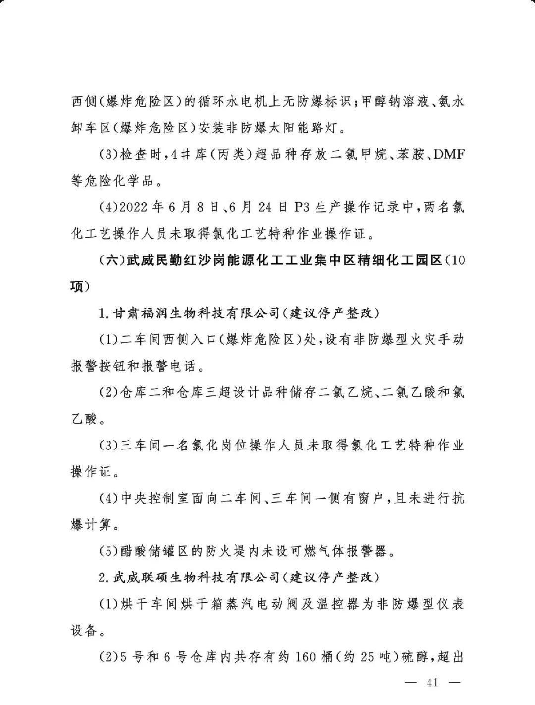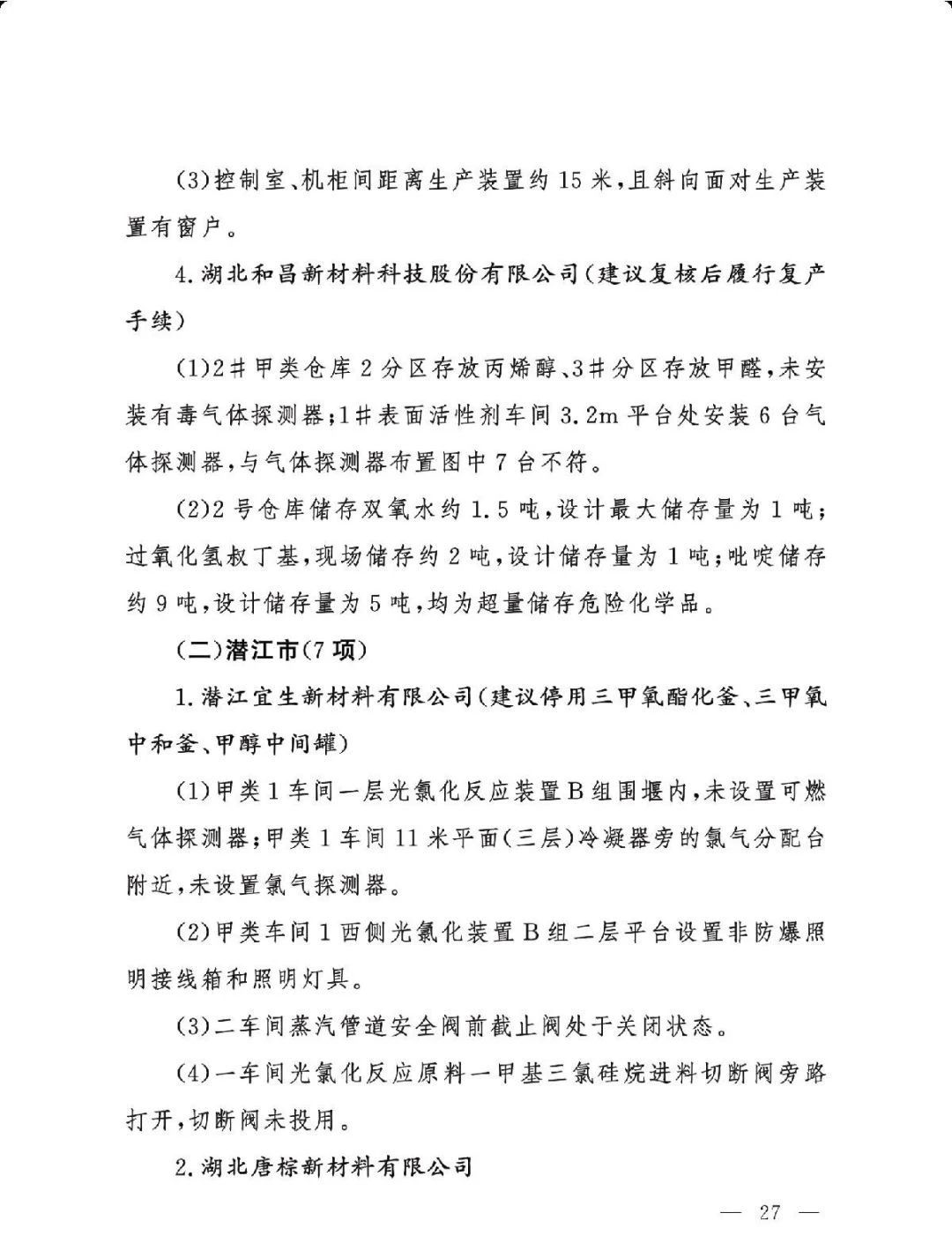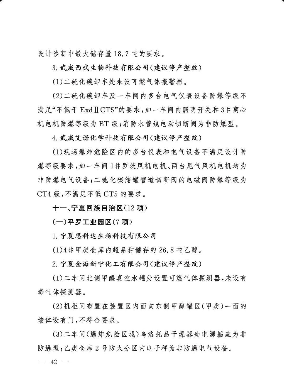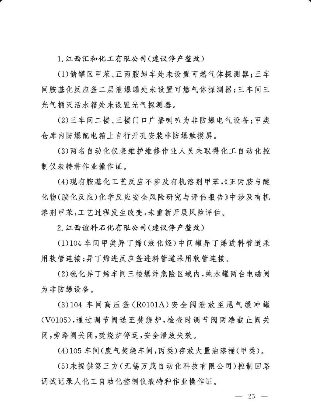 (二)基础差风险高的现状未根本改变。一是部分企业隐患问题突出。江西核查的19家企业平均问题数29.5项,平均重大隐患数2.6项。甘肃核查的24家企业中,62.5%的企业因重大隐患多、不具备安全生产条件被建议停产整改或停用相关设施。二是个别化工园区基础差。山西、湖南、青海还有4个园区尚未认定。