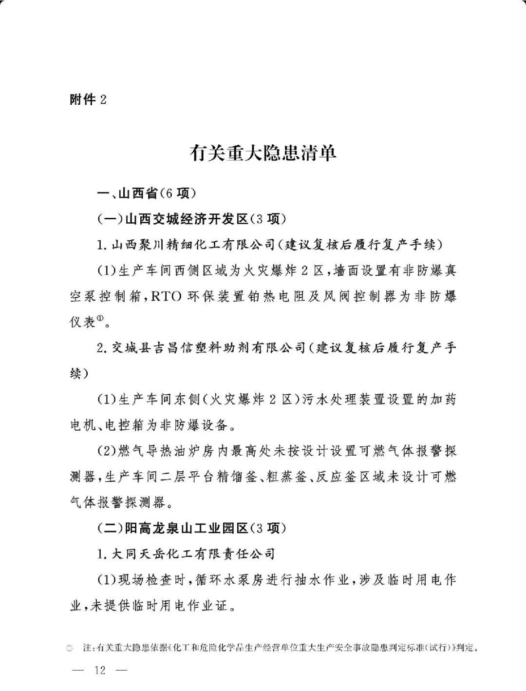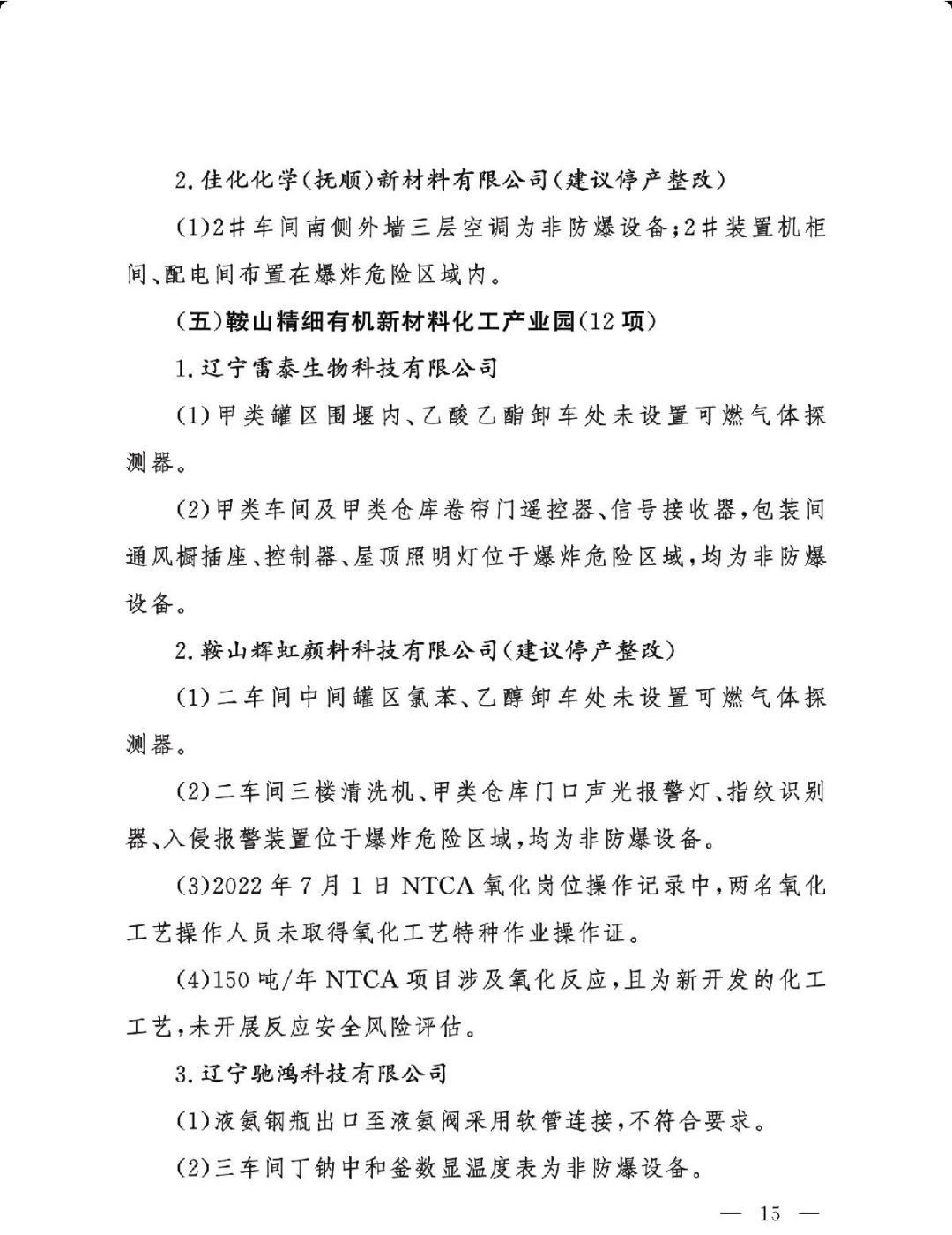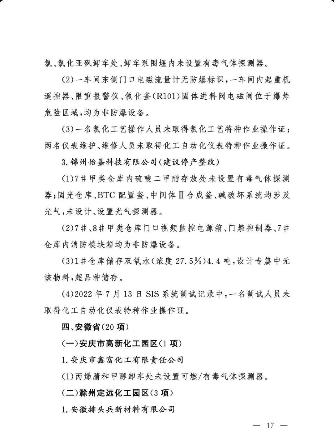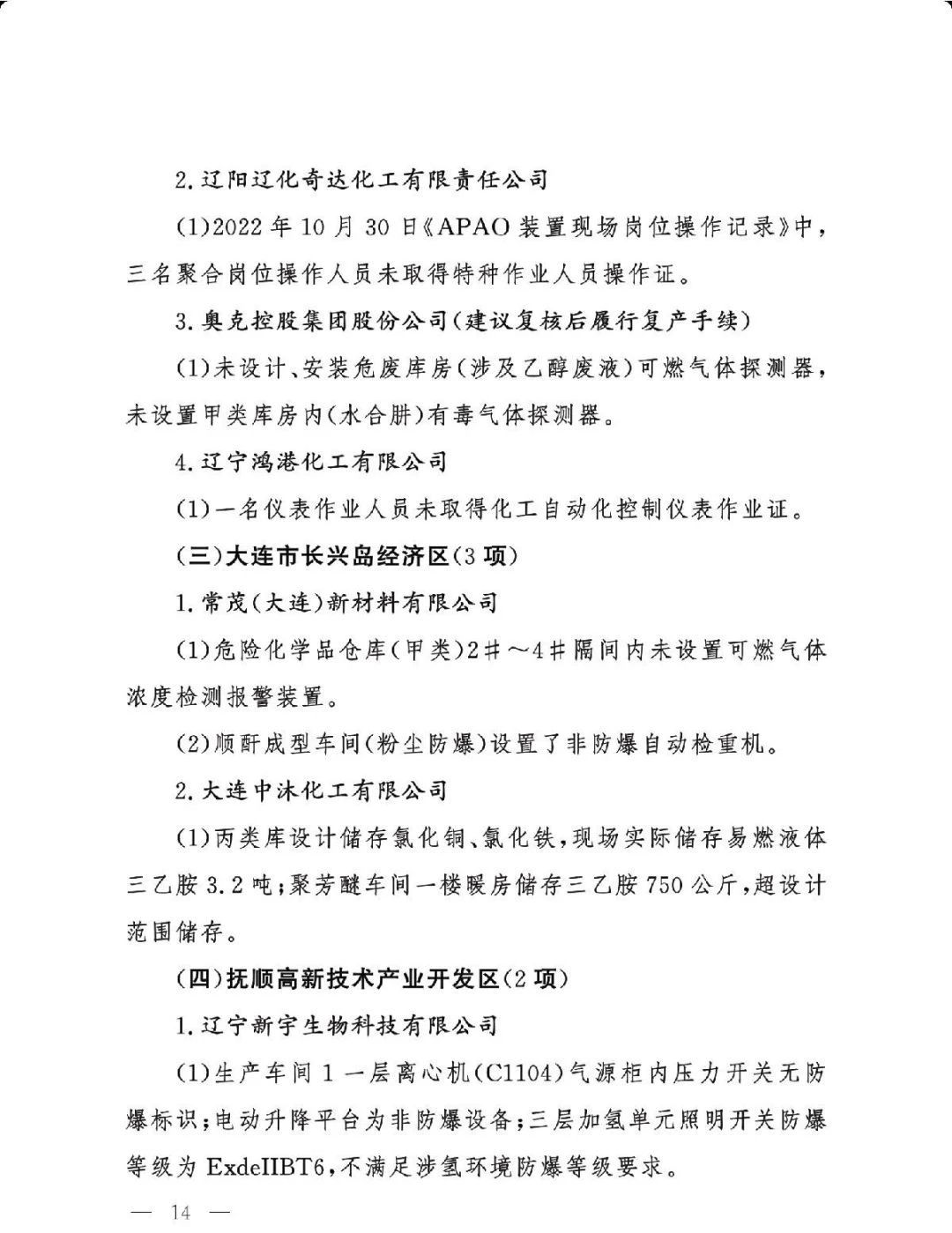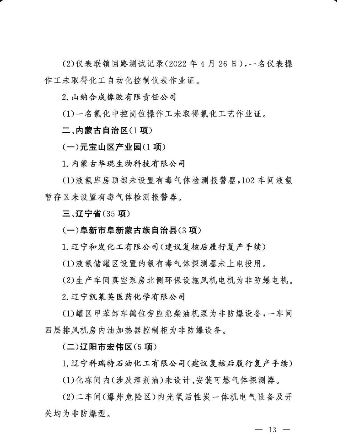 (三)严格问题整改。各有关地区要深刻吸取辽宁盘锦浩业化工有限公司“1·15”重大事故教训,有关省级安委会办公室要对248项重大隐患挂牌督办,督促企业举一反三抓紧整改,确保闭环管理,要对排名后10位的重点县(园区)进行约谈,对目前仍未认定的4个园区加快认定评估工作,对经整改提升后仍无法达到一般安全风险等级的园区取消认定化工园区资格;有关市级应急管理部门要组织对整改情况进行复核,对建议复核后履行复产手续的企业要严格复产程序;有关省级应急管理部门要组织专家对建议停产或停用相关设施设备的41家企业整改情况以及安全条件重新确认,确保具备安全生产条件后方可恢复生产。