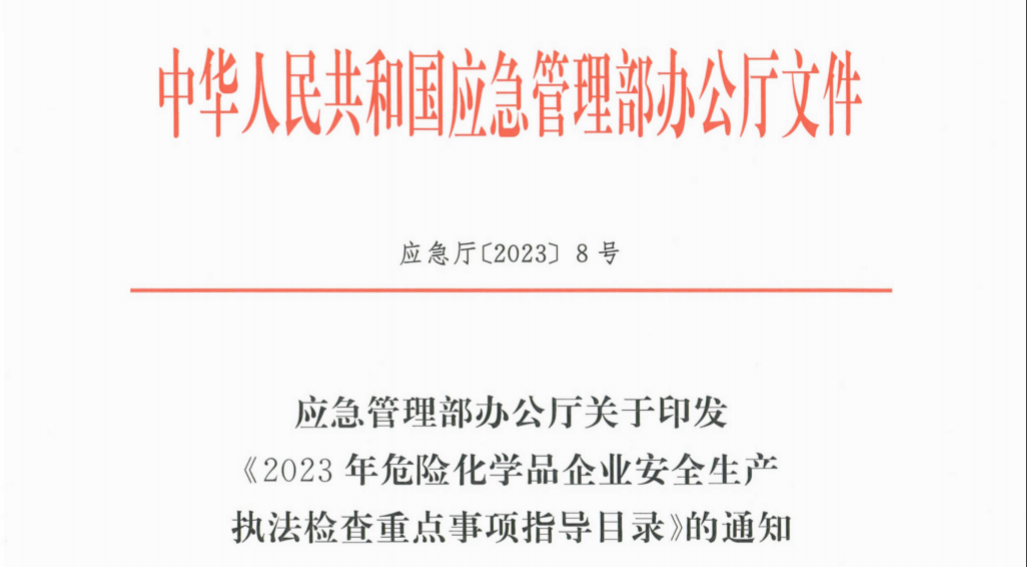 为进一步加强和规范危险化学品安全生产监管执法工作,指导地方提高执法检查效能,督促危险化学品企业落实安全生产主体责任,现将《2023 年危险化学品企业安全生产执法检查重点事项指导目录》(以下简称《指导目录》)印发给你们,并将有关事项通知如下: