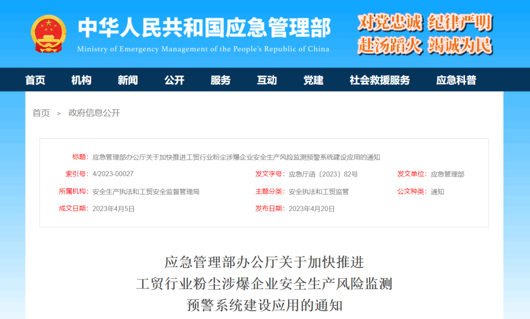 ​应急管理部办公厅关于加快推进工贸行业粉尘涉爆企业安全生产风险监测预警系统建设应用的通知