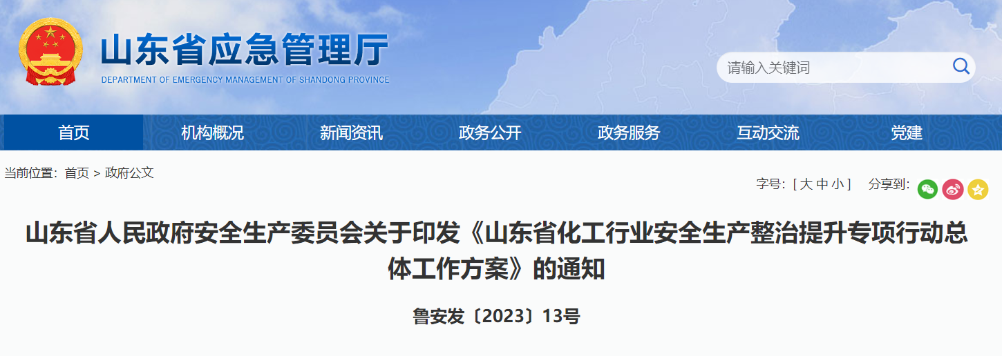 山东省化工行业安全生产整治提升专项行动总体工作方案印发!