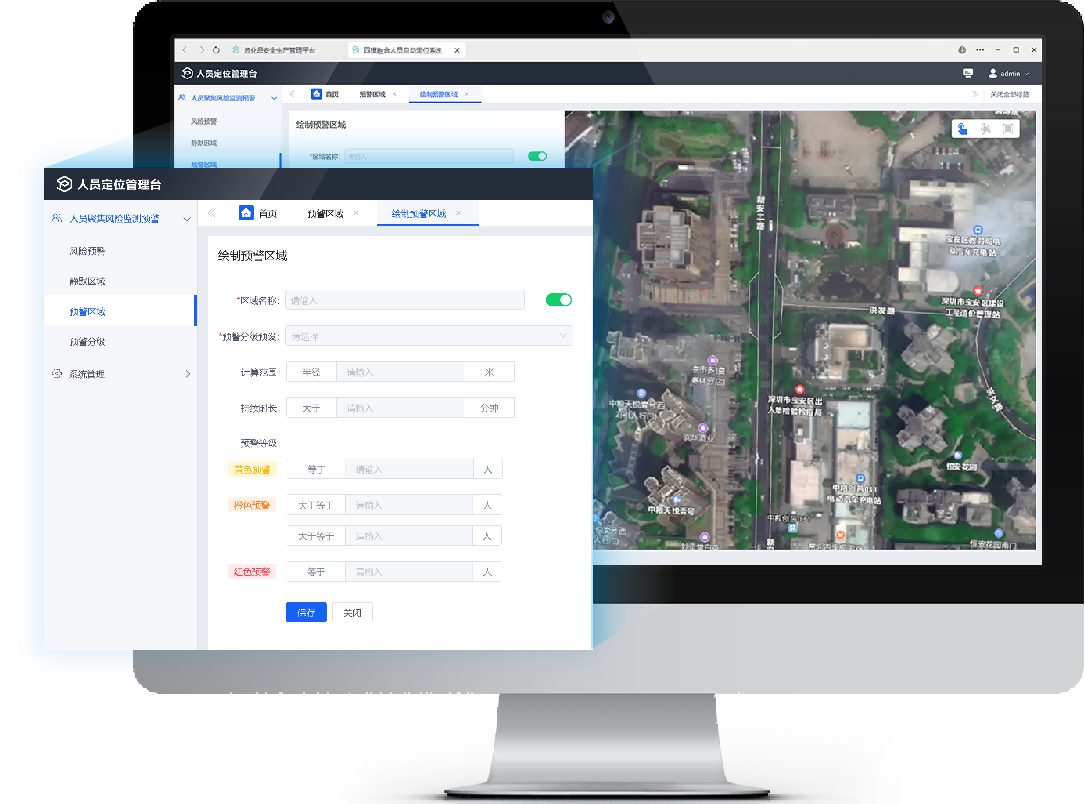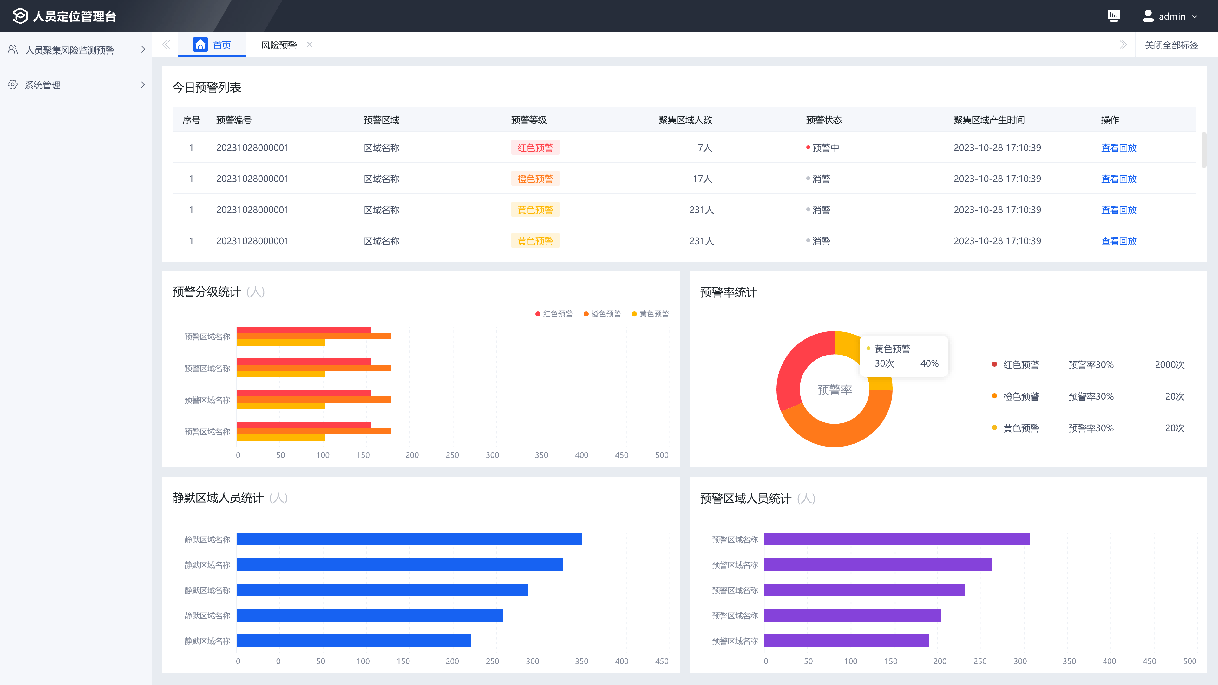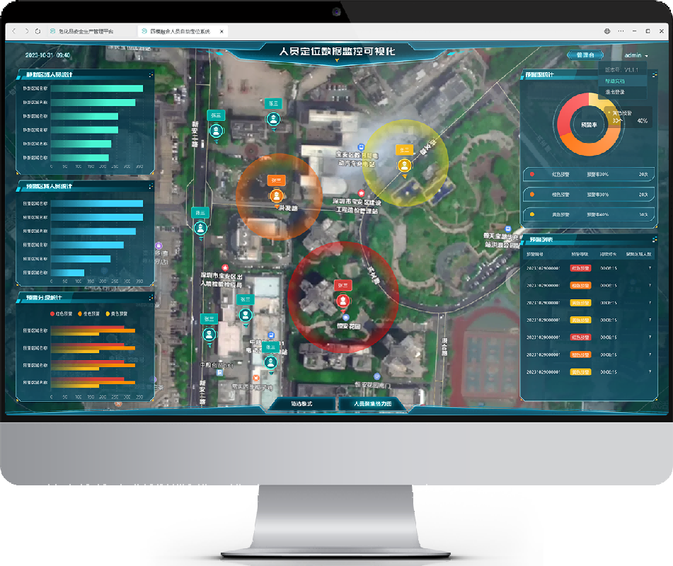 系统采用蓝牙、卫星、GPS、基站四模融合高精度定位技术实时获取人员定位信息,生成聚集热力图,无需观测监控就可获得人员分布情况,通过预先设定的阈值和规则,可以快速识别人员聚集风险,并及时向相关人员发送警报信息。