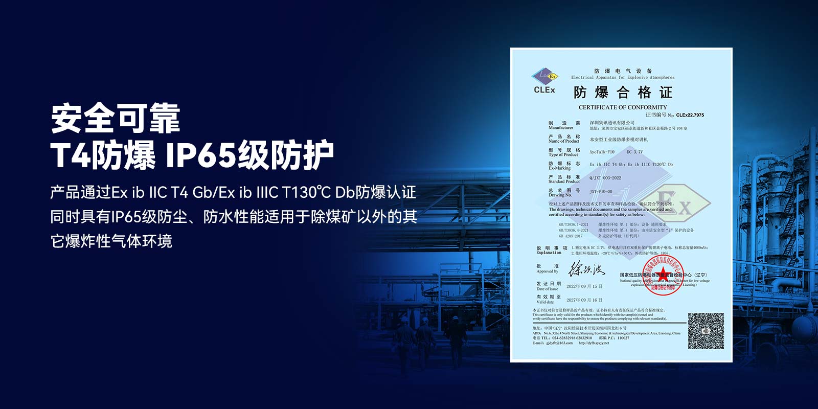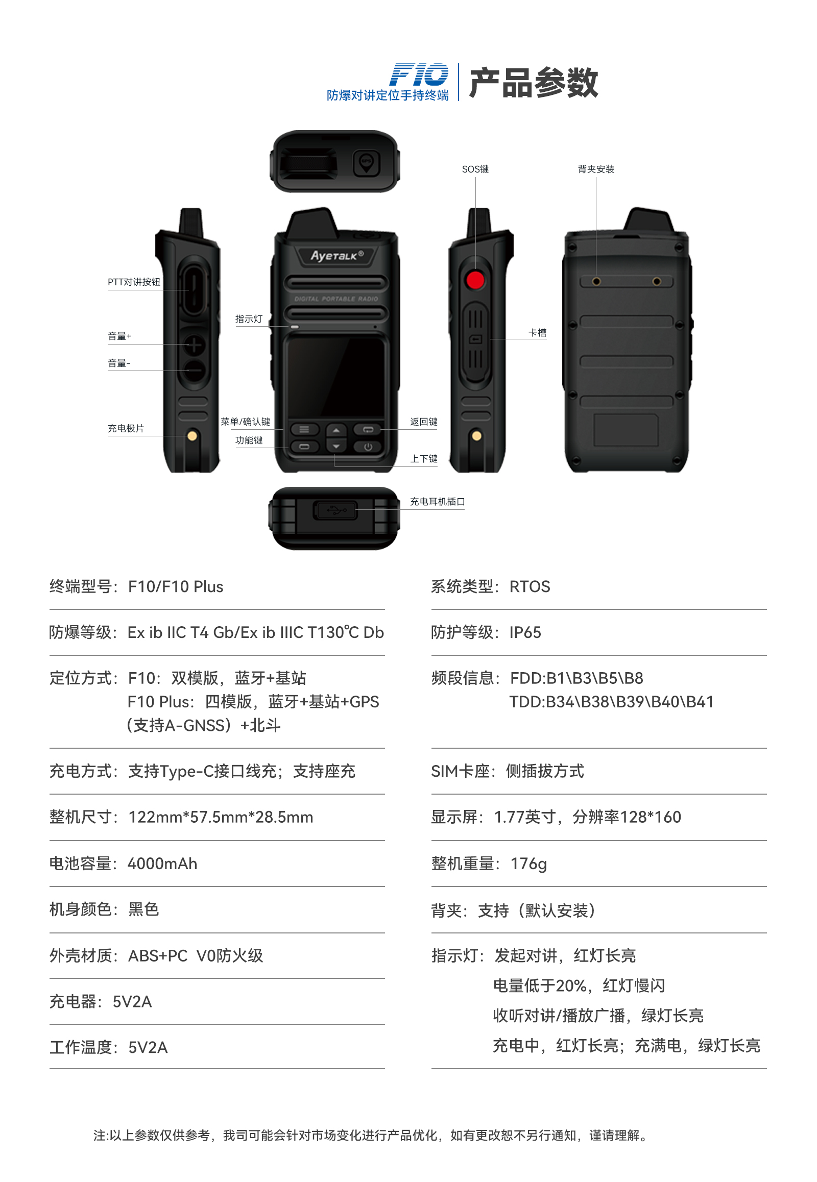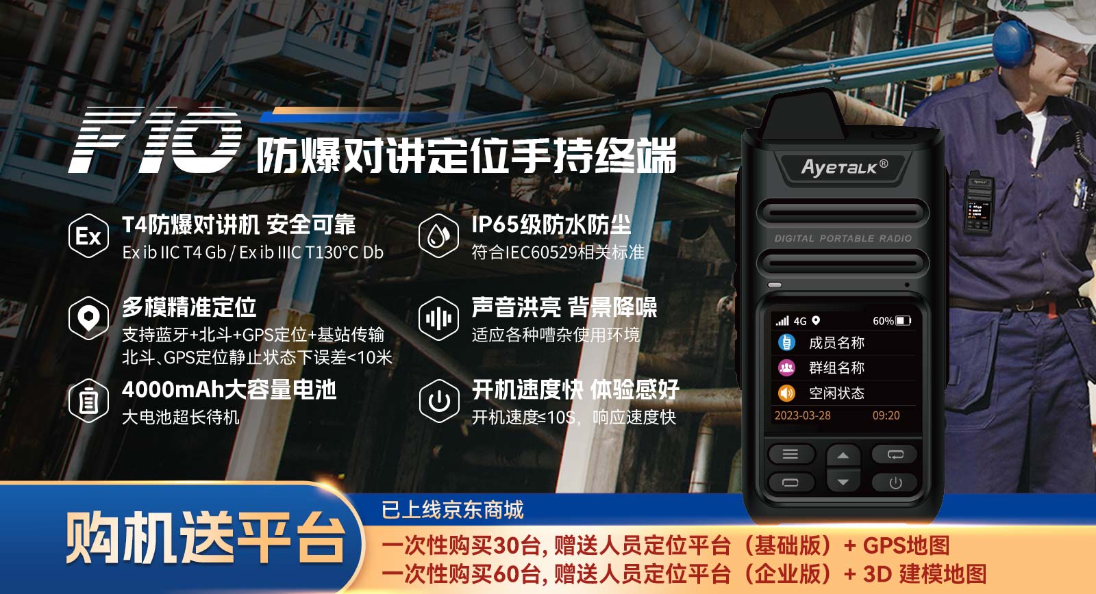 本安型防爆定位对讲机F10是我司为化工等危险行业打造的一款支持双模(蓝牙+基站)或四模(蓝牙+基站+GPS+北斗)定位+公网集群对讲的本安型防爆终端。拥有国家认证防爆证书和防爆标识,该防爆对讲机适用于石油、化工、钢铁、港口等含有易燃易爆气体环境的场所,满足防爆需求行业用户安全通讯及精准定位,消除了非防爆通信设备带来的安全危险。